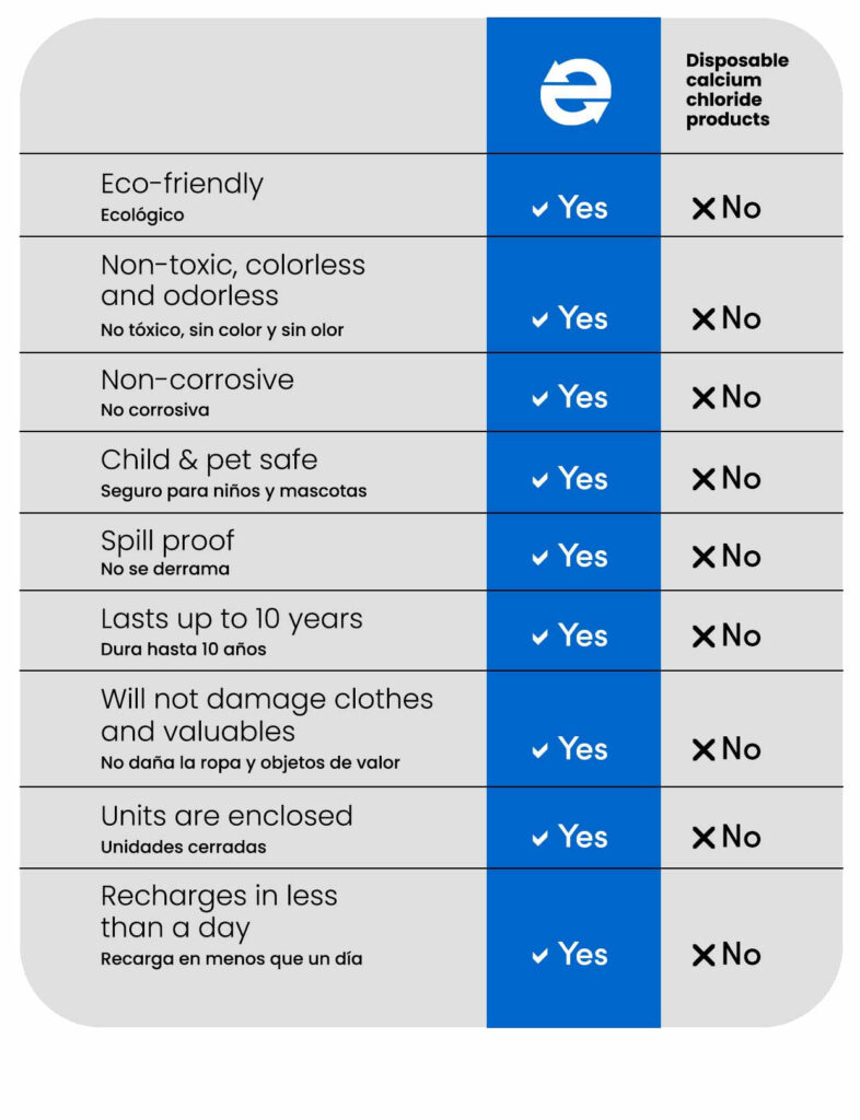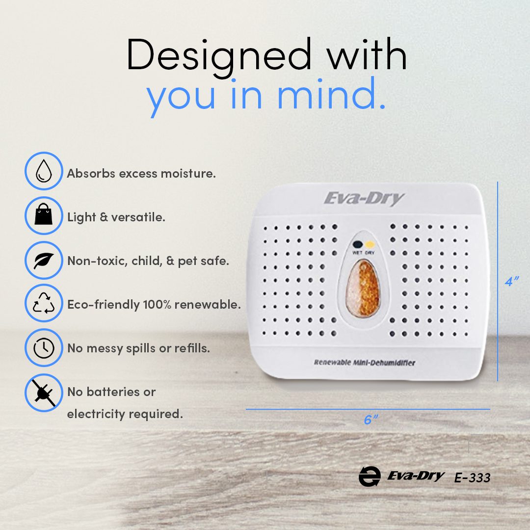 I originally found these at Costco 2 1/2 yrs ago. I bought two 2-packs calculating that was how many needed for the 10’x20′ cargo container I had my household stored in. The four units would last 4 weeks and would need to recharge. They worked much better than those messy crystals in the buckets that you had to pour down the toilet to get rid of. The Eva-Dry E-333 were reliable and so clean. Within the last year I upgraded to the E-500’s to give me more peace of mind that over last winter I wouldn’t have any mold and mildew issues. I also had something to swap out with during recharge periods. I recently was able to purchase a new home and move everything out of the container. Happy to say I did not have any mold or mildew issues, and the wood furniture was not warped or damaged. I am now going to use these in my garage and upstairs inside my home to make sure over the winter I don’t start anything nasty. These are a great product.